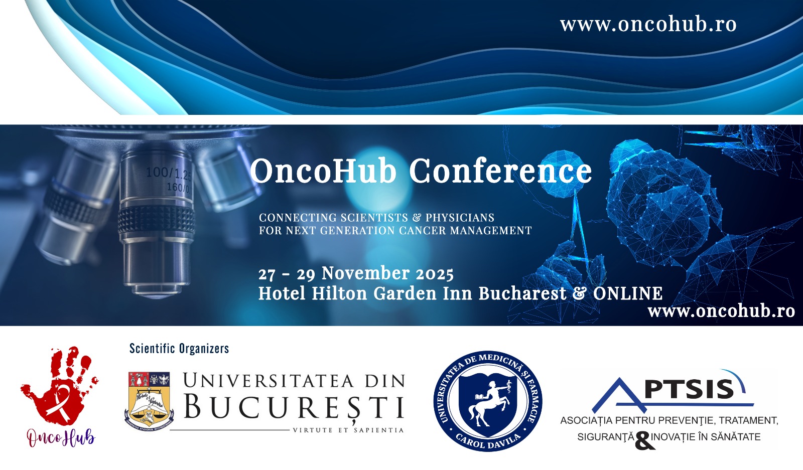 În numele Comitetului de Organizare, avem plăcerea de a vă ura un călduros bun venit la Cea de-a 5-a Ediție a Conferinței OncoHub – Connecting Scientists and Physicians for Next Generation Cancer Management, care va avea loc în perioada 27-29 NOIEMBRIE 2025, în format hibrid.