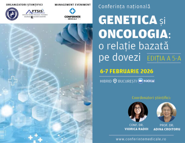 Suntem onorați să vă adresăm invitația de a participa la cea de-a cincea ediție a Conferinței Naționale GENETICA ȘI ONCOLOGIA – O RELAȚIE BAZATĂ PE DOVEZI, care va avea loc în București, între 6 – 7 februarie 2026, sub coordonarea doamnei Prof. Dr. Adina Croitoru și a doamnei Conf. Dr. Viorica Rădoi.