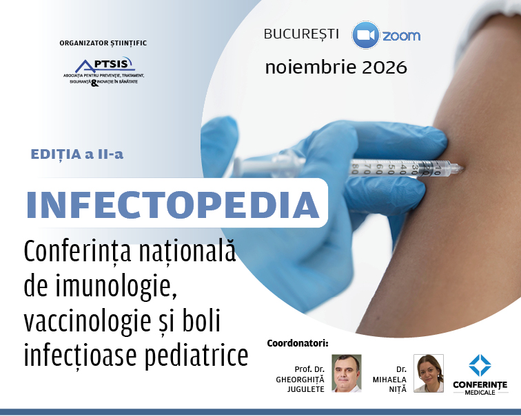 Avem deosebita plăcere de a vă invita la InfectoPedia – Conferința Națională de imunologie, vaccinologie și boli infecțioase pediatrice, ce va avea loc în noiembrie 2026, în format hibrid.